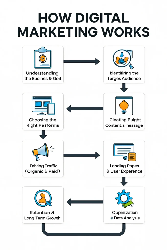 In this blog, we’ll explain the complete digital marketing process, exactly how it works from the first click to final conversion — in simple English, without jargon.